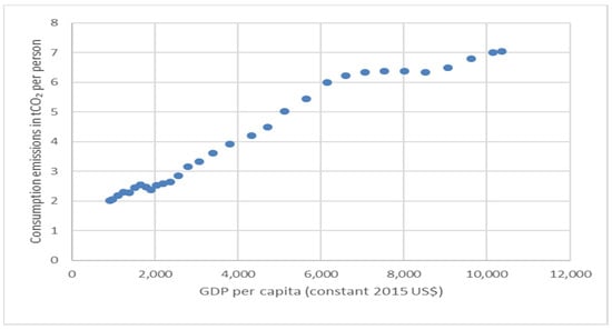 A scatter plot of the relationship between per capita consumption-based CO2 emissions and per capita GDP. Sources of data: Global Carbon Atlas [] and World Bank [].