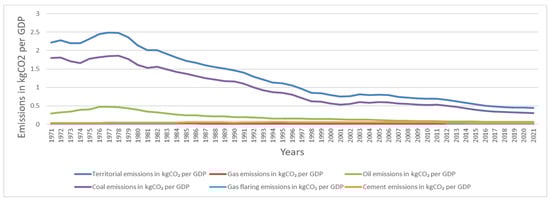 The trend in average CO2 emissions per unit of GDP from various energy and sectoral sources. Source of data: Global Carbon Atlas [].