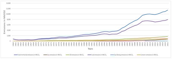 The trend in total CO2 emissions from various energy and sectoral sources. Source of data: Global Carbon Atlas [].