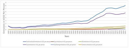 The trend in per capita CO2 emissions from various energy and sectoral sources. Source of data: Global Carbon Atlas [].