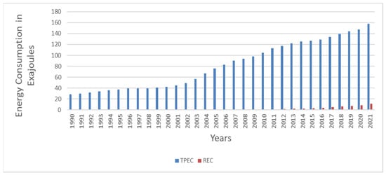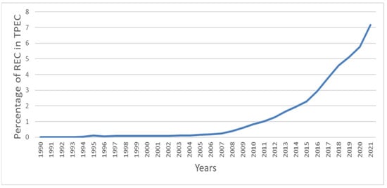 The trend in the percentage of REC in TPEC. Source of data: BP [].