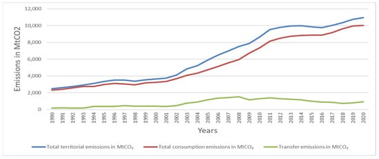 The trends in total territorial, consumption, and transfer emissions. Source of data: Global Carbon Atlas [].