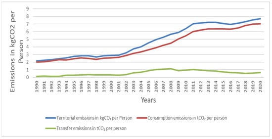 The trends in per person territorial, consumption, and transfer emissions. Source of data: Global Carbon Atlas [].