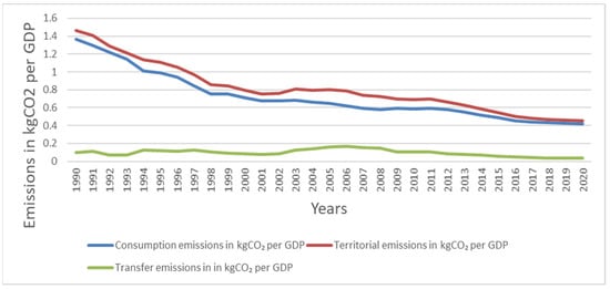 The trends in territorial, consumption, and transfer emissions per unit of GDP. Source of data: Global Carbon Atlas [].