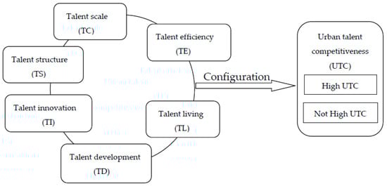 Urban talent competitiveness refers to the comprehensive effect of various factors such as the quantity, scale, quality, ability, structural level, output efficiency and growth environment of talent resources, and then, generates a comparative competitive advantage over other cities in terms of introducing, cultivating and stimulating talent potential [,]. The generation of urban talent competitiveness is a complex process, which is affected by multiple factors. To generate urban talent competitiveness, two aspects are involved: one is the talent attraction of the city, such as talent scale, quality structure, talent benefits and so on [,]; the other is the city’s ability to acquire, maintain and develop talents; this is reflected in the attraction talents of cities [,]. The widely recognized study of the World Competitiveness Yearbook published by IMD sets the complex factors of talent scale, talent structure, talent innovation, talent development, talent efficiency and talent living []. Then, the paper deeply analyzes the production mechanism of urban talent competitiveness in view of these six conditions.