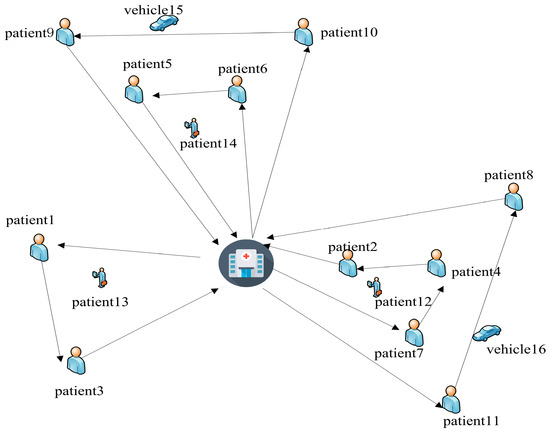 This paper takes a medical center with 7 patients, 3 caregivers and 2 vehicles, as an example, in which patients 1–3 need HHC services and patients 4–7 need synchronous services. Set the patients who need synchronous services to add a virtual patient with codes of 8, 9, 10 and 11; that is, numbers 1–11 represent patients, 12–14 represent caregivers, and 15–16 represent transport vehicles. The codes are shown in Figure 2. There are three HHC service paths and two HDV service paths. (0, 13, 1, 3, 0) indicates that the path of caregiver 12 is 0-1-3-0; (0, 14, 9, 10, 0) means that the path of delivery vehicle 14 is 0-9-10-0, and so on.