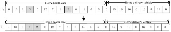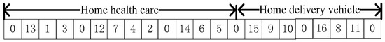 Since the model involves the visit order and service type of patients, and the nodes of caregivers and patients are discrete points, we adopt a two-stage non-negative integer coding method; each chromosome represents an individual. The first part of the code represents HHC service and the second part represents HDV service. For a medical center with N patients, k caregiver, and v vehicles, the patient code is , the caregiver code is , and the vehicle code is . 0 indicates the medical center. Each value represents a gene, and the gene order represents the access order of the caregiver. According to the constraints of caregiver working time limit, patient service time window, caregiver-patient skill matching, vehicle distance restriction, and so on. Use 0 to separate the paths into different sets. The first gene of each path represents the number of the caregiver or vehicle, and other genes are patient numbers. A new route will be constructed when caregiver exceeds the required working hours.