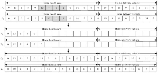 Cross operation is prone to the loss and redundancy of gene information. To solve this problem, a new crossover operator is used in this paper. We have comprehensively considered skills matching, patient service order, time window, and distance constraints, which can not only solve a series of constraint problems, but also improve the diversity of solutions on the basis of the original chromosomes. In this paper, the random number (0, 1) is used to determine whether the HHC route or the HDV route should be cross operated. Assuming that the random number is 0, take the HHC path for example, and the crossing steps are as follows.
