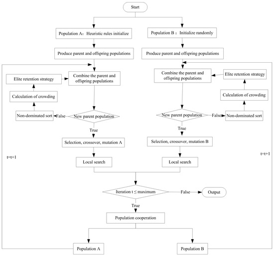 In order to improve the quality of the solution and strengthen the information exchange between populations, some scholars improved the deficiency of the population evolution by exchanging the genetic information carried by excellent individuals [33]. After genetic operation and local search, completed, respectively, by population A and population B, non-dominated sorting is conducted. Exchange the first 50% of the individuals to form a new population A and population B for the next iteration.