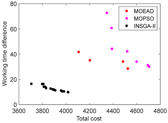 In order to explain the rationality of the solution more clearly, we randomly select one of the 18 examples for analysis, taking HHC-R207 as an example. Considering the layout limitation, we introduce two solutions for HDV lines, one of which is the solution with the lowest total cost, and the other is the greatest balance, as shown in Table 6. The distribution of non-dominated solutions of different algorithms is shown in Figure 7.
