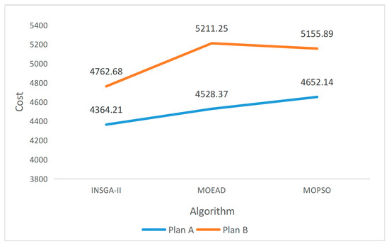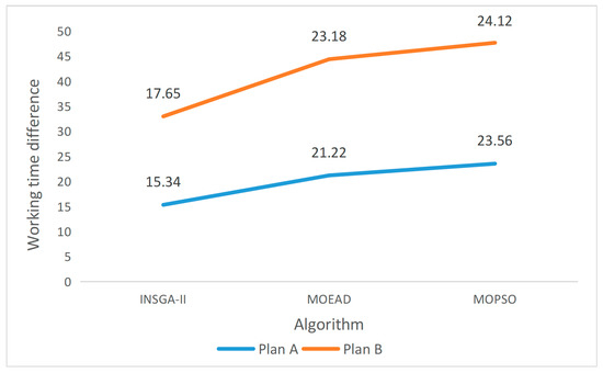 Taking into account the multiple needs of patients, some health care centers will directly arrange a highly skilled caregiver to provide one-time services to patients, and some others will assign multiple caregivers to provide collaborative services. However, there is a lack of strict division of service needs, and the waste of resources caused by the deviation between basic services and healthcare is not considered. When the caregivers and the vehicles conduct synchronous access, the vehicle can leave after providing services for the current patient, which can reduce the vehicle’s stay time. To verify the effectiveness of the optimization of synchronous access, we analyzed the service schemes under different access forms. The scheme settings are shown in Table 7. Among them, Plan A is the caregiver-vehicle synchronous visit mode proposed in this paper, and Plan B is the traditional synchronous visit mode between caregivers. Randomly select HHC-C107 from the above standard examples as the case for analysis, the three algorithms in this paper are used for comparison simulation. Each case is run 10 times respectively, and the average value is taken as shown in Figure 8 and Figure 9.