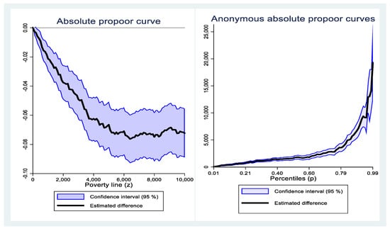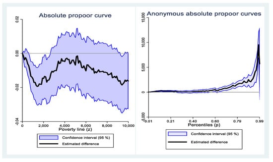 According to the measurement results in Figure 1, combined with the determination criteria of the absolute pro-poor curve measurement method of economic growth, the primal-approach absolute pro-poor curve is located below the zero dividing line () within the poverty line of 0–10,000 yuan; that is, compared with 2014, the poverty incidence in 2016 decreased, but the upper limit of the 95-percent confidence interval of the curve lies above the zero dividing line. On the whole, from 2014 to 2016, China’s rural economic growth was absolutely pro-poor, but the results were not robust.
