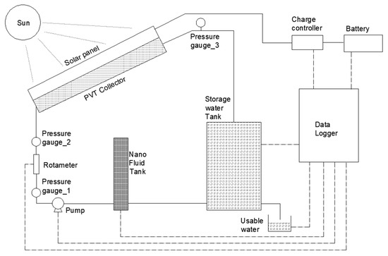 The proposed methodology was fabricated to analyze the efficiency of nano-PCM and nanofluid PVT systems, which were compared to liquid PVT systems and stand-alone PV modules simultaneously. Further, water as a coolant at variable flow rates was conducted into the PVT system, and nano-PCM and nanofluid with different concentrations and flow rates were carried out via the photovoltaic thermal collector. The final system is a self-contained PV module that operates normally. Figure 1 depicts a photograph of the experimental procedure. Figure 2 depicts a schematic depiction of the experimental setup.