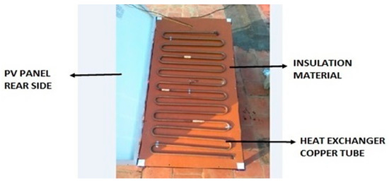 To build a photovoltaic thermal collector, a multi-silicon glass panel of 1640 mm × 992 mm × 35 mm was acquired. Due to the insulation effect of the platform, a 0.4 mm copper sheet was employed on the rear of the solar panel for heat absorption. Furthermore, the copper tube is utilized as a heat absorber from the rear side of the solar panel with magnitudes of 1.0 cm external and 0.8 cm internal diameters. The performance of the solar panel at the typical test settings is shown in Table 1. The photovoltaic thermal system was mounted at an angle of 13° to the South hemisphere. Readings were taken at 15-minute intervals every day between 8 a.m. and 5 p.m. for all weather conditions and output powers. Figure 3 shows a copper tube coupled with a solar panel.