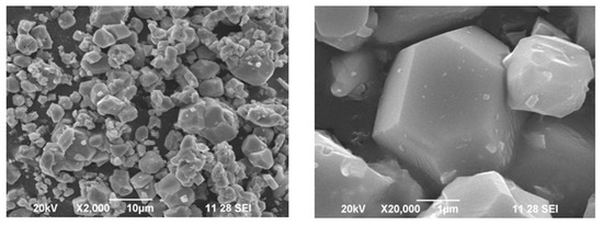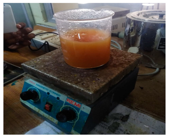 Throughout the studies, manganese chloride (MnCl2), glycine, ammonia, distilled water, polyethylene glycol (PEG-400), and distilled water were used. All the compounds used in the investigation were analytical-grade reagents and were not further purified. The amount of 0.5 M of manganese chloride solution was added to 50 mL of purified water and agitated for 30 min. The amount of 0.3 M of glycine was added to 50 mL of distilled water and stirred for 30 min, and finally, the two were mixed together. To this solution, NAOH was continuously added to get a PH of 10, turning the solution a brownish color. The residual solution was evaporated overnight at 80 °C in a hot air oven. Finally, the mixture was kept in a muffle furnace for 3 h at 750 °C. Manganese oxide powder is now ready. The preparation of nanoparticles and nanofluid in the laboratory is revealed in Figure 4. An SEM image of the MnO nanoparticle is shown in Figure 5.