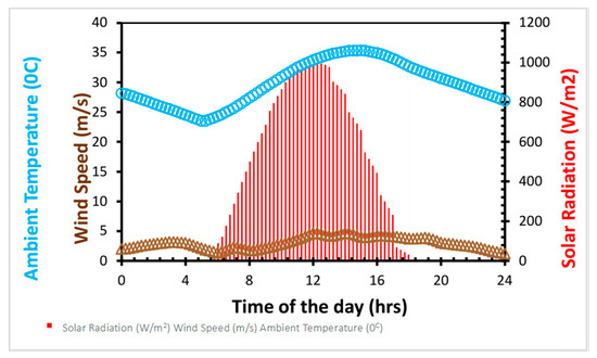 The average meteorological data of an experimental day is depicted in Figure 6, where solar radiation, wind speed, and ambient temperature appear as a canopy structure. This gives real-world data from a specific location where the system’s projected performance, based on solar radiation, wind speed, and ambient temperature, may be determined. The diurnal average incoming solar radiation dispersion for the experiment period creates a megaphone shape, with the largest value at noon being 1017.07 W/m2 and the smallest value being 538.98 W/m2 at 8 a.m., according to this graph. The average daily air temperature climbs from 26.84 °C at 8:00 a.m. to 33.66 °C at noon, and decreases to 28.23 °C at 5:00 p.m.