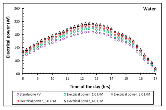 Figure 7 displays the variations in electrical power obtained, with time for all tested liquid flow rates ranging from 1 to 4 LPM. Equation (2) is used to calculate electrical power for all four flow rates in conjunction with a stand-alone PV system. Electrical power increased up to 12 p.m., when it began to fall due to increasing solar intensity. Because a stand-alone PV system does not have a cooling facility, a large glazing surface was acquired on the testing days. This single PV system generated less electricity than the other cooling systems. The life period of the stand-alone PV system was shorter when compared to alternative cooling PVT systems. Furthermore, this image resembles a mushroom form, symbolizing how morning progressively increases till midday and then decreases until dusk. In general, as the flow rate grew, so did the electrical output of the PV panels. The following diagrammatic depiction shows the maximum electrical power generations as 188 W, 197 W, 203 W, 208 W, and 215 W at flow rates ranging from 1 to 4 LPM.