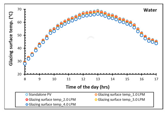 Glazing surface temperature of four flow rates with a stand-alone PV system with water as a coolant.