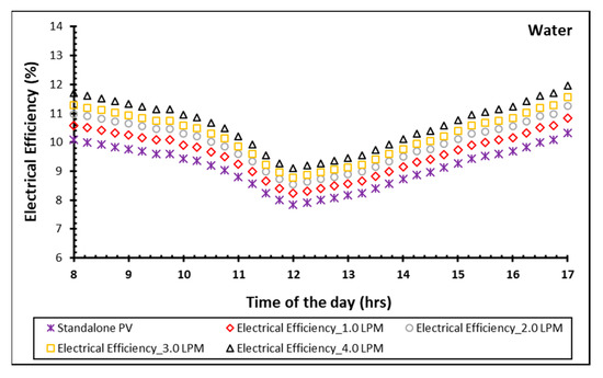 Figure 9 demonstrates the time-dependent trends in electrical efficiency for all examined liquid flow rates ranging from 1 to 4 LPM. The electrical efficiency of the photovoltaic thermal system was evaluated using Equations (1), (3), and (4). During the electrical energy analysis, characteristics, such as maximum power point voltage, maximum power point current, solar radiation, and solar panel area, were evaluated for all designs. There was a rise in glazing surface temperature and lower electrical efficiency from 9 h to 12 h, then vice versa till 16 h. It was discovered that when the glazing surface temperature was at its highest, electrical efficiency was at its lowest between 11:00 a.m. and 1:00 p.m. Electrical efficiency, like electrical power, improved as the coolant flow rate increased. The use of nanofluid resulted in an improvement in the electrical efficiency of the PV system. The maximum electrical efficiency reached in this research investigation was 12%, close to what Waeli et al. accomplished with similar types of power [38,39,40], and used liquid as a coolant to reach maximum electrical efficiencies of 10.3%, 10.8%, 11.2%, 11.6%, and 12.1 %.