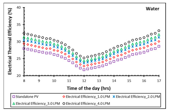 Electrical thermal efficiency of four flow rates with a stand-alone PV system with water as a coolant.