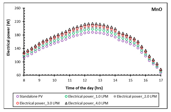 Figure 11 depicts the time-dependent fluctuations in electrical power achieved for all investigated liquid-based MnO nanofluid flow rates ranging from 1 to 4 LPM. As previously stated, Equation (2) may be used with a stand-alone PV system to create electrical power for all four flow rates. The generation of electrical power demonstrates the lifetime of the PV or PVT system as well as the application elements of the concerned system. The average electrical power production at flow rates ranging from 1 to 4 LPM was 152.3 W, 164.5 W, 169.1 W, 175.1 W, and 182.8 W. At flow rates ranging from 1 to 4 LPM, the greatest electrical power produced was 188 W, 203 W, 209 W, 216 W, and 226 W.