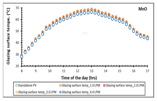The trends in the glazing surface obtained over time for all investigated flow rates of 1–4 LPM of liquid-based MnO nanofluid are shown in Figure 12. Every 1 °C increase in temperature over the recommended operating temperature on the PV panel surface results in a 0.5%drop in efficiency. Overheating solar cells generates thermal stress, reducing the lifespan of PV cells [7,8,9]. The average glazing surface or solar panel temperatures were 57.1 °C, 55.4 °C, 54.2 °C, 53.1 °C, and 52.5 °C for flow rates ranging from 1 to 4 LPM. The greatest glazing surface temperatures for the four flow rates of 1–4 LPM with a freestanding PV system were 69.2 °C, 67.1 °C, 65.7 °C, 64.4 °C, and 63.7 °C.