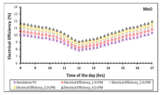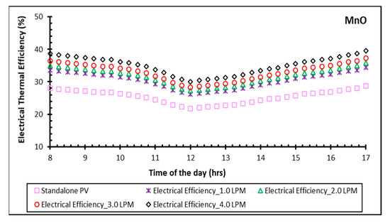 The trends in electrical efficiency achieved over time for all investigated flow rates of 1–4 LPM of liquid-based MnO nanofluid are shown in Figure 14. Electrical efficiency and electrical thermal efficiency factors were directly reliant on one another. The average electrical thermal efficiencies were 25.4%, 30.5%, 31.8%, 33.1%, and 35.1% for flow rates ranging from 1 to 4 LPM. The greatest electrical thermal efficiencies for the four flow rates of 1–4 LPM with a freestanding PV system were 28.7%, 34.4%, 35.8%, 37.3%, and 39.6%.
