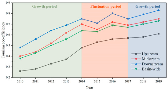 Regional differences in tourism ecological efficiency were observed in the basin. The upstream region consistently exhibited lower efficiency than the basin average throughout the study period but maintained an upward trend. In contrast, the middle and upper reaches of the basin showed a stable increase in efficiency from 2010 to 2014, followed by fluctuations and reversals from 2014 to 2017 and a subsequent upward trend. The efficiency values in the middle and upper reaches of the basin consistently exceeded the basin average, while the downstream region showed a slower rate of increase in efficiency compared to the upstream and middle reaches. The tourism ecological efficiency in the Hanjiang River Basin can be classified into three stages: growth stage (2010–2014), fluctuation stage (2014–2017), and growth stage (2017–2019). This classification reflects a fluctuating trend of first increasing, then decreasing, and then increasing again. Furthermore, the increase in efficiency in the upstream and middle reaches was significantly greater than that in the downstream reaches.