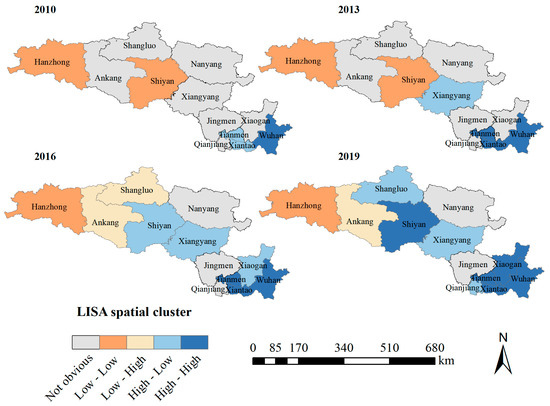 The local indicators of spatial association (LISA) of the Hanjiang River Basin in 2010, 2013, 2016, and 2019.