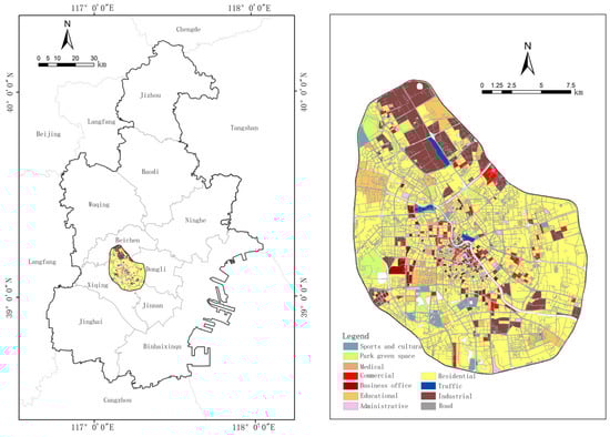 Traditional urban surface temperature studies are often carried out on a two-dimensional “urban–rural” scale, with less research on specific parcels within cities, while urban planning activities for surface temperature improvement need to be guided more directly [12]. Neglecting the spatial heterogeneity of the effectiveness of parcel function and spatial morphological parameters on surface temperature may lead to incorrectly assessing surface temperature and its effects. Therefore, some scholars have introduced urban zoning to explore these diverse influences and have adopted the local climate zone (LCZ) to discuss the surface temperature problem, which divides urban areas according to different ground covers and building morphologies to form several homogeneous parcel units with similar spatial morphological parameters and then classifies and discusses the surface temperature of the same parcel units [13,14]. In recent years, the traditional LCZ model has been accordingly extended, among which the urban functional zone (UFZ) is widely used, being a classification aid in developing differentiated urban planning control measures that can directly guide micro-detailed planning efforts [15]. UFZ divides the study area according to differences in socio-economic and population activities, reflecting the differences in the dominant functions of urban parcels; moreover, the spatial boundaries of UFZs are usually enclosed by urban streets and natural landscapes [16]. In this paper, we construct a UFZ model for the old urban area of Tianjin, China, and explore the relationship between the spatial morphological parameters of different types of UFZs on the surface temperature from two levels: (1) Different types of UFZs have different surface temperature thresholds, so the coefficients of the same spatial morphological parameters’ influence on different UFZs’ surface temperatures need to be quantified. (2) The spatial scale differences in different spatial morphological parameters’ effects on surface temperatures in the same UFZ need to be measured.