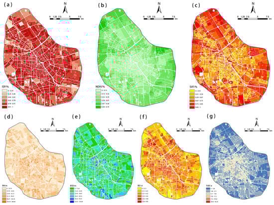 Distribution of urban form characteristic parameters. (a) The proportion of impervious water surface, (b) NDVI index, (c) sky openness, (d) the average height of block buildings, (e) standard deviation of block building height, (f) block building density, and (g) block floor area ratio.