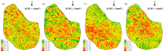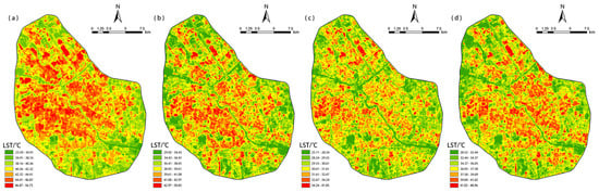 Inversion results of summer land surface temperature in Tianjin from 2017 to 2020. (a) Summer 2017, (b) summer 2018, (c) summer 2019, and (d) summer 2020.