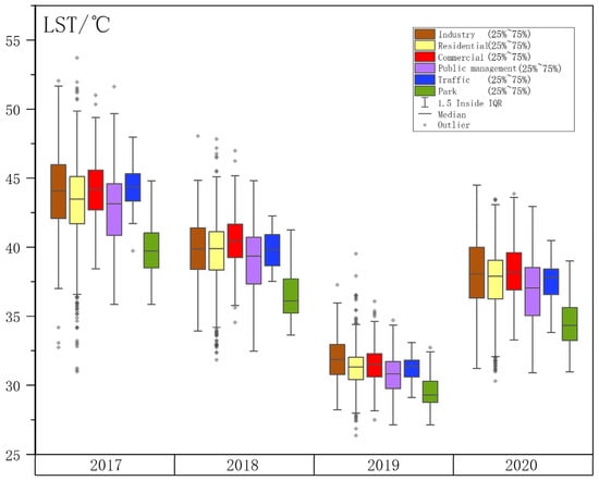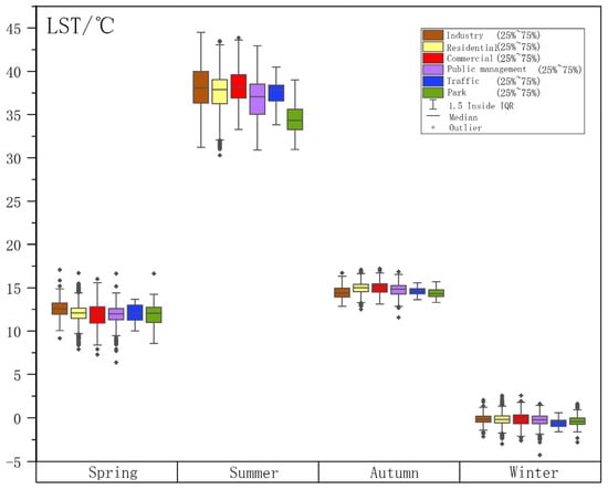 By comparing the temperature differences of various blocks (Figure 5 and Figure 6), from the interannual summer surface temperature variation, we found (1) the temperature range of the blocks dominated by industrial, residential, and public management services is larger, and these blocks are prone to produce highly differentiated surface temperature intervals due to their diverse spatial forms; (2) high surface temperature occurs in industrial, residential, and commercial districts, which is consistent with the high intensity of human activities; (3) traffic blocks also have a higher surface temperature, mainly because they have the highest impervious water surface proportion (ISP), which will reflect a lot of solar radiation and cause the temperature to rise; and (4) the median surface temperature of parkland blocks was the lowest, and the temperature interval and outlier values were lower than those of the other five functional blocks, indicating that this block type had a stable cooling effect. According to the quarterly changes in the land surface temperature in 2020: (1) the median land surface temperature values in spring, autumn, and winter in 2020 were similar, and the temperature change range was smaller than that in summer; (2) the industrial blocks’ surface temperature is the highest in spring and summer, but it decreases in autumn and winter, and the warming effect caused by human activities is more significant, with the industrial blocks’ surface temperature being lower than that of the other blocks; and (3) the surface temperatures of green space and park blocks were higher than that of traffic blocks in spring and winter because the water area of the former was higher, meaning it could conserve more heat.