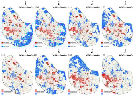 Temporal and spatial distribution of heat island footprint. (a) Summer 2017, (b) summer 2018, (c) summer 2019, (d) summer 2020, (e) spring 2020, (f) summer 2020, (g) autumn 2020, and (h) winter 2020.