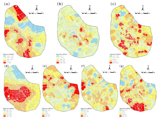 MGWR model regression coefficient distribution in Tianjin in the summer of 2020. (a) Sky openness, (b) proportion of impervious water, (c) NDVI index, (d) standard deviation of block building height, (e) block plot ratio, (f) average block building height, and (g) block building density.
