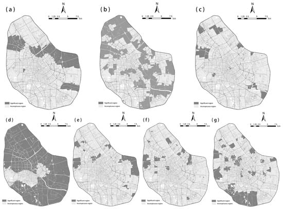 Significant regional distribution of MGWR model t-test in Tianjin in summer 2020. (a) Sky openness, (b) proportion of impervious water, (c) NDVI index, (d) standard deviation of block building height, (e) block plot ratio, (f) average block building height, and (g) block building density.