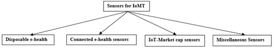 The IoMT-based application relies on the filed sensor and other sensors to carry out their designated task as per the IoMT architecture. The sensors used in the system are the most vital elements, as they are the first receptors for IoMT-based applications. In the case of the IoMT, there are various categories of e-healthcare sensors, such as disposable e-health sensors, connected e-health sensors, IoT-market cap sensors, and miscellaneous sensors.