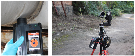 Gamma spectroscopy in field-deployed nuclear industrial archaeology. (Left) a portable NaI(Tl) gamma spectrometer of type Mirion SPIR-Ace [52] used to measure gamma radiation dose rates in excess of on the outside of a pipe connecting a mixer–settler tank in a legacy uranium ore processing facility. (Right) a collimated gamma spectrometer [53] mounted on a pan-tilt unit and suspended on a tripod to map contamination in an industrial environment [51].