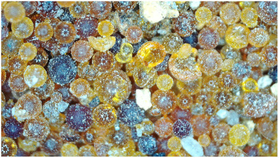 Optical microscopy of ion exchange resin spill, observed in situ. To the naked eye, this was indistinguishable from finely ground ore sand, but its real nature became clear under the microscope (see Figure 2) which also enabled a particle size distribution and morphology to be characterised.