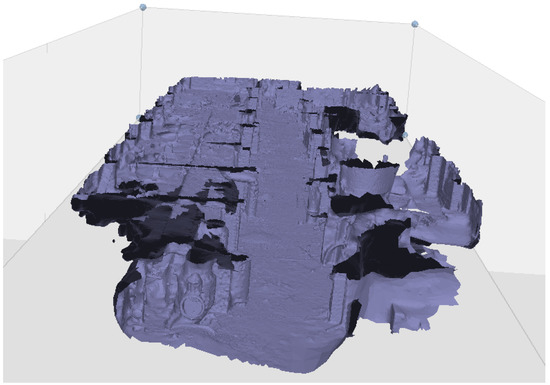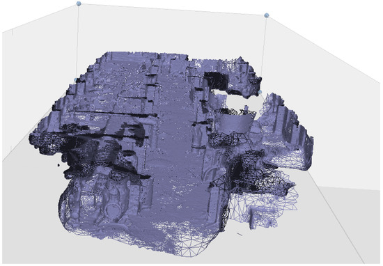 These sets of points are then processed within histogram software and analysed for similarities and combined into a point cloud showing the likely position of all photographs. This is then further analysed to produce a wireframe mesh, as seen in Figure 4. This mesh is then turned into a solid model, as seen in Figure 5. The texture is then mapped onto this mesh to create an image that a viewer can interpret, as seen in Figure 6.
