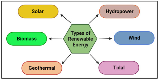 Renewable energy is produced by using resources that are found naturally and slowly replenish themselves. Therefore, even if there are finite supplies of these resources at a given time, there is generally not a concern that they will run out completely. In addition, compared to conventional fossil fuels, RE generates fewer greenhouse gases and contaminants. Some examples of renewable energy are solar, wind, hydroelectric, geothermal, biomass, and marine energy [12]. Green energy, meanwhile, is a form of energy that has a positive impact that helps to save the environment from pollution and global warming. Unlike RE, it does not release any harmful carbon emissions and also reduces carbon footprints. Green energy is a subset of RE and includes only those resources that have the greatest environmental benefits [13]. For instance, wind power is an example of both green and renewable energy as trees can be planted and grown repeatedly, but burning wood is RE, not green energy, as it produces environmental pollution and is responsible for global warming after it is burnt. Different types of renewable energy source have been presented in Figure 1.