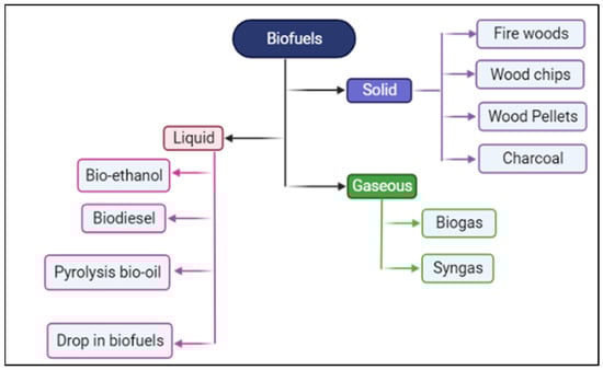 As opposed to the drawn-out natural processes that leads to the formation of fossil fuels like oil, biofuels are swiftly harvested from biomass. Biofuels burn similarly to natural gas, and they are gradually but steadily replacing natural gas. Despite being created by the anaerobic decomposition of biomass, biogas primarily consists of methane gas. The majority of agricultural businesses use biogas, which is now packed in gas cylinders for consumption in homes. There is an urgent need for a novel sustainable strategy for producing bioenergy because of the concerning rise in our reliance on fossil fuels like oil, coal, and natural gases. One such method for achieving a sustainable development of bioenergy is the effective execution of a zero-waste discharge policy, which can only be achieved by turning organic wastes into bioenergy. The conversion of organic waste is strongly advised because waste management is essential for reducing the problem and threat of wastes. The main renewable energy sources, include biogas, bioethanol, coal, hydrogen, and biodiesel, are discussed below, along with their advantages and disadvantages [14,15]. The biomass utilized in the production of the various biofuels is categorized as follows (Figure 2).