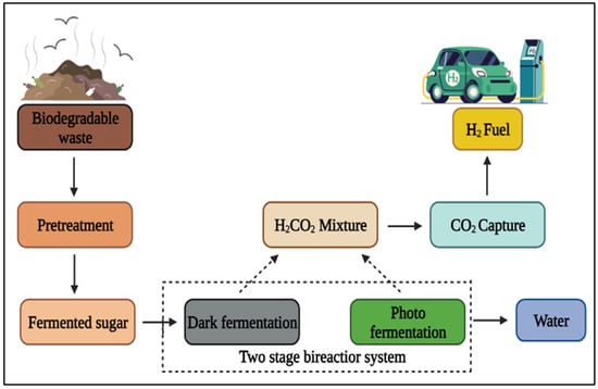 The biological approach (dark fermentation) is regarded as the most environmentally benign and sustainable of these technologies, and it is one of the most widely used procedures for producing biohydrogen. Dark fermentation has been observed to be an favorable procedure that involves a two-phase anaerobic treatment system, even if only 15–20% of the theoretical hydrogen potential of carbohydrates is recovered. Using anaerobic sludge as the inoculum, microbial species analysis of hydrogen-producing cultures reveals the presence of Streptococcus bovis, Clostridium cellulosi, Clostridium acetobutylicum, and Clostridium tyrobutyricum. The anaerobic glycolytic breakdown of carbohydrates typically leads to the formation of fermentative hydrogen. Theoretically, 12 moles of H2 can result from the complete oxidation of 1 mole of hexose to CO2 [36]. The dark fermentation technique coverts complex products to simpler ones through hydrolysis [37]. The advantage of creating H2 through fermentation is that it may do so under comfortable conditions and also profit from the remaining biomass valorization. Dark fermentation is more appealing since it has better production rates than photofermentative methods as well as the ability to utilize organic and wastewater wastes [36]. By further combining biohydrogen generation technology with additional products like bioalcohol, volatile fatty acids (VFAs), and CH4, the effectiveness and economics of the overall process may be improved [38].