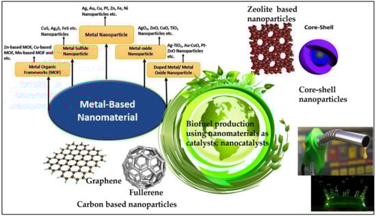 A substance or material that exhibits catalytic properties and at least one nanoscale dimension, physically or in terms of internal structures, is referred to as a nanocatalyst (NC). Because there is more surface area available for reacting with the reactants thanks to NC’s high surface-to-volume ratio, the catalyst performs better overall. They can be divided into two major categories based on whether a catalyst is present in the same phase as the substrate: heterogeneous catalyst and homogeneous catalyst [11]. Depending on the types of feedstock materials used, several types of biofuels like bioethanol, bioethanol, biogas, and biodiesel are produced. One of these is the manufacturing of biodiesel, which accelerates the development of clean and sustainable fuel. Biodiesel is produced utilizing a variety of techniques, including pyrolysis, direct blending, micro-emulsion, and trans-esterification, with a critical discussion focusing on boosting biodiesel output with nanocatalysts [45]. Biodiesel is a liquid fuel made of long-chain fatty acid esters generated from micro- and macro algal oil, animal fats, and vegetable and nut oils. One of the innovative and promising methods for producing biodiesel on a large scale is the use of nanocatalysts (Figure 4). Using a nanocatalyst, which generates various fatty acid methyl esters compositions, makes it simple to change its physico-chemical properties (FAME) [45,46].