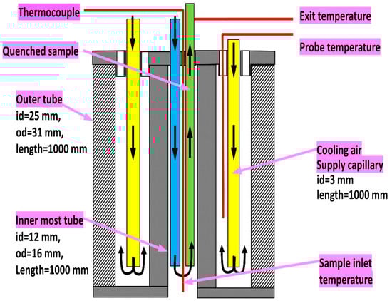 The pyrolysis of methane, ethane and butane were carried out in the absence of oxygen in a high-temperature tube reactor under laminar flow conditions and within a temperature range of 869–1213 °C. The external surface of the reactor tube was electrically heated to the desired temperature with the aid of a PID temperature controller. The tube had a length of 1440 mm and an inner diameter of 104 mm. The hydrocarbon test fuel was mixed homogeneously in nitrogen diluent preheated to 200 °C and the mixture entered the reactor at the bottom of the tube. The reactor temperature profile and its operation were described in detail previously [23,24,45,46,47]. The reactants were sampled along a length of the tube where the longitudinal temperature of the reactants was constant. For the study presented here, a novel sampling probe assembly was developed, with details of the probe shown in Figure 1. The probe allowed the collection of a small amount of gas sample along the axis of the heated section of the reactor during fuel pyrolysis. Upon collection, the gas sample was immediately quenched by diluting it with nitrogen. Figure 1 shows the construction of the probe, which comprised two concentric ceramic tubes with inner diameters of 25 mm and 18 mm. Four stainless steel capillaries with a 3 mm internal diameter were used to extract the sample gas, supply nitrogen to dilute and quench the sampled gas, and also for conveying air to cool the ceramic probe walls.