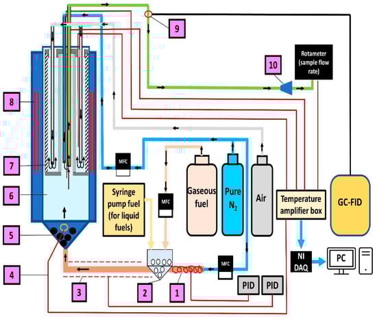 Schematic diagram of the tube reactor with gaseous and liquid fuel lines for gaseous species sampling. (1) N2 heater Fuel, (2) Vaporiser (liquid fuels), (3) Heated line, (4) Mixer temp, (5) N2/fuel Mixer, (6) Reactor tube, (7) Sampling probe, (8) Heating elements, (9) Sample extraction Septum for GC-FID, (10) Vacuum pump, PID: Temperature controller, MFC: Mass flow controller, NI DAQ: National Instrument data acquisition.