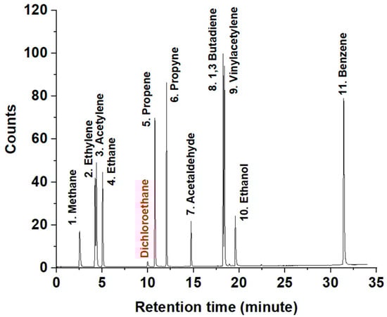 For the identification of gaseous species using the GC-FID, an external standard mixture was used containing 11 selected species detailed in Figure 3. The selected species (up to C6) were potential intermediates that contribute to the formation of benzene rings and PAHs growth. The species in the external standard mixture were at a 1000 ppm concentration diluted in nitrogen.