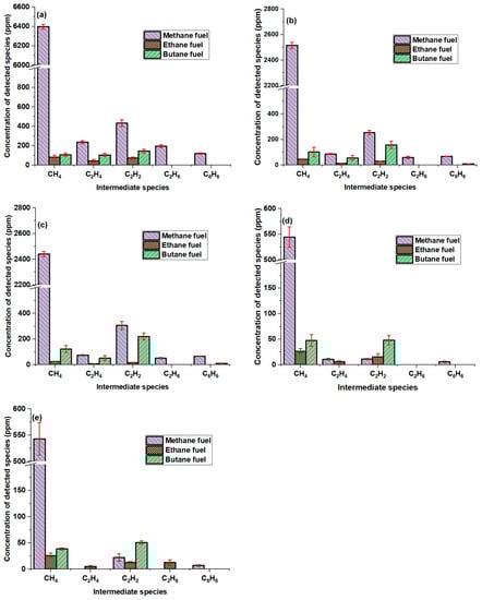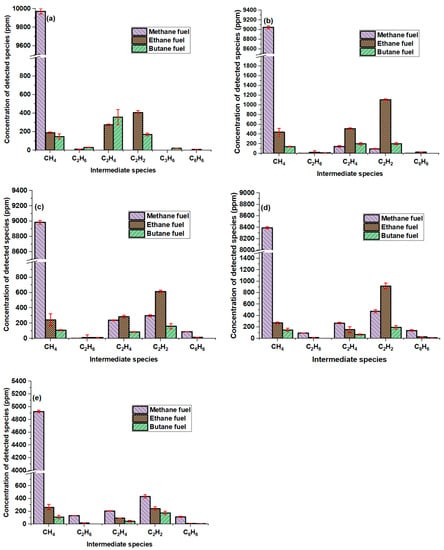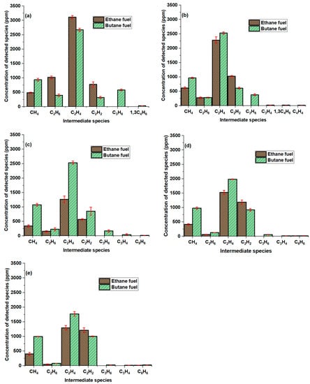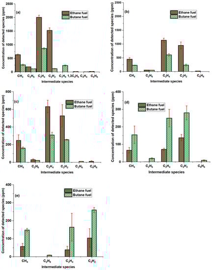Concentration of detected species during ethane and butane pyrolysis at constant temperature of 869 °C and increasing residence time of (a) 0.65 s, (b) 0.98 s (c) 1.31 s, (d) 1.63 s, and (e) 1.96 s. Error bars denote one standard deviation. Note that no intermediate species were detected in the case of methane fuel at this temperature.
