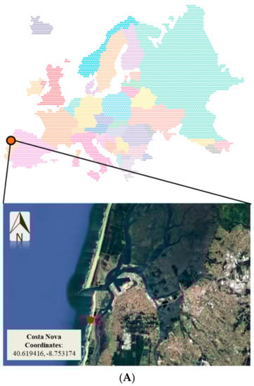Samples were taken from a sandy beach in Costa Nova, located on the western coast of Portugal, bathed by the North Atlantic Ocean (Figure 1A). This coastal area belongs to the village of Ílhavo, with an area of 73.47 square kilometres and a population of 41,200 inhabitants. Ílhavo belongs to the district of Aveiro, which is located at an altitude of less than 100 m, occupying a coastal plain with an extension of 40 km in the southern part of the district. The landscape of this plain is dominated by the Ria of Aveiro and the Vouga river basin. From a geomorphological point of view, the Ria de Aveiro is a shallow lagoon located on the Atlantic coast of north-western Portugal, 45 km long and 10 km wide, consisting in a meso-tidal system that receives freshwater inflows from the Antuã and Vouga rivers [].
