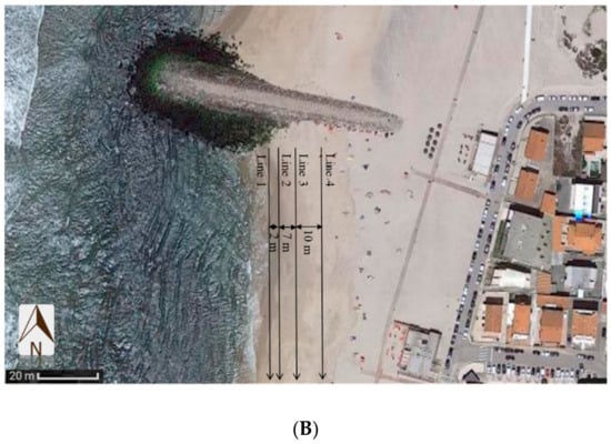Samples were taken in one sample campaign in November 2019. During this month, the average precipitation value was higher than normal in the central and northern parts of the country, with values close to 150% of the monthly average value. In addition, temperatures were lower than normal, with average daily values between 8 and 12 °C during the central days of the month when sampling was carried out. Further, this area is usually affected by strong northerly winds [,]. At the sampling points, the beach was protected with a breakwater, whose structure allows the reduction of waves and prevents the decantation of sand.
